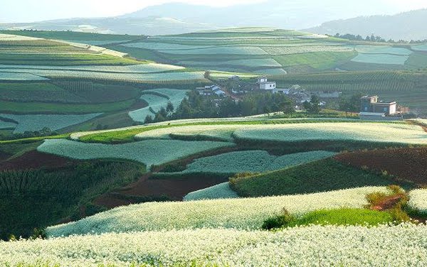 In provincia Yunnan, mai precis la sud-vest de Kunming, capitala acesteia, dealurile, a caror altitudine nu depaseste 800 de metri, sunt complet acoperite de culori vii, intr-un melanj incredibil, capabil sa iti taie rasuflarea. Motivul acestui fenomen il reprezinta concentratia mare de minereuri feroase care, datorita unei lungi perioade de oxidare, au dat reliefului o neobisnuita culoare rosie. Peste toate se adauga sutele de culturi diferite ale taranilor chinezi, practic nicio parcela nu este lasata la voia intamplarii, culorile acestora intregind un peisaj care i-ar fi lasat muti pana si pe pictorii suprarealisti...